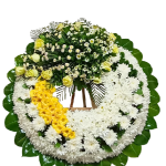 Elaborada con flores blancas y amarillas, como crisantemos, rosas y flores de temporada, acompañadas de follajes verdes naturales, esta corona simboliza homenaje y memoria. Es una opción tradicional y adecuada para ceremonias fúnebres, servicios conmemorativos y expresiones formales de condolencia.