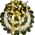 Corona fúnebre elaborada con flores blancas y amarillas, cuidadosamente dispuestas en un diseño circular que simboliza la eternidad y el recuerdo. Su armoniosa composición transmite un mensaje de respeto, paz y homenaje en el momento de despedida.