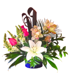Elaborado con lirios blancos o azucenas, orquídeas, rosas en tonos vivos y flores de temporada, acompañado de follajes verdes naturales y elementos estructurales decorativos, este arreglo simboliza homenaje y memoria. Ideal para ubicar en mesas auxiliares o espacios conmemorativos durante la ceremonia.